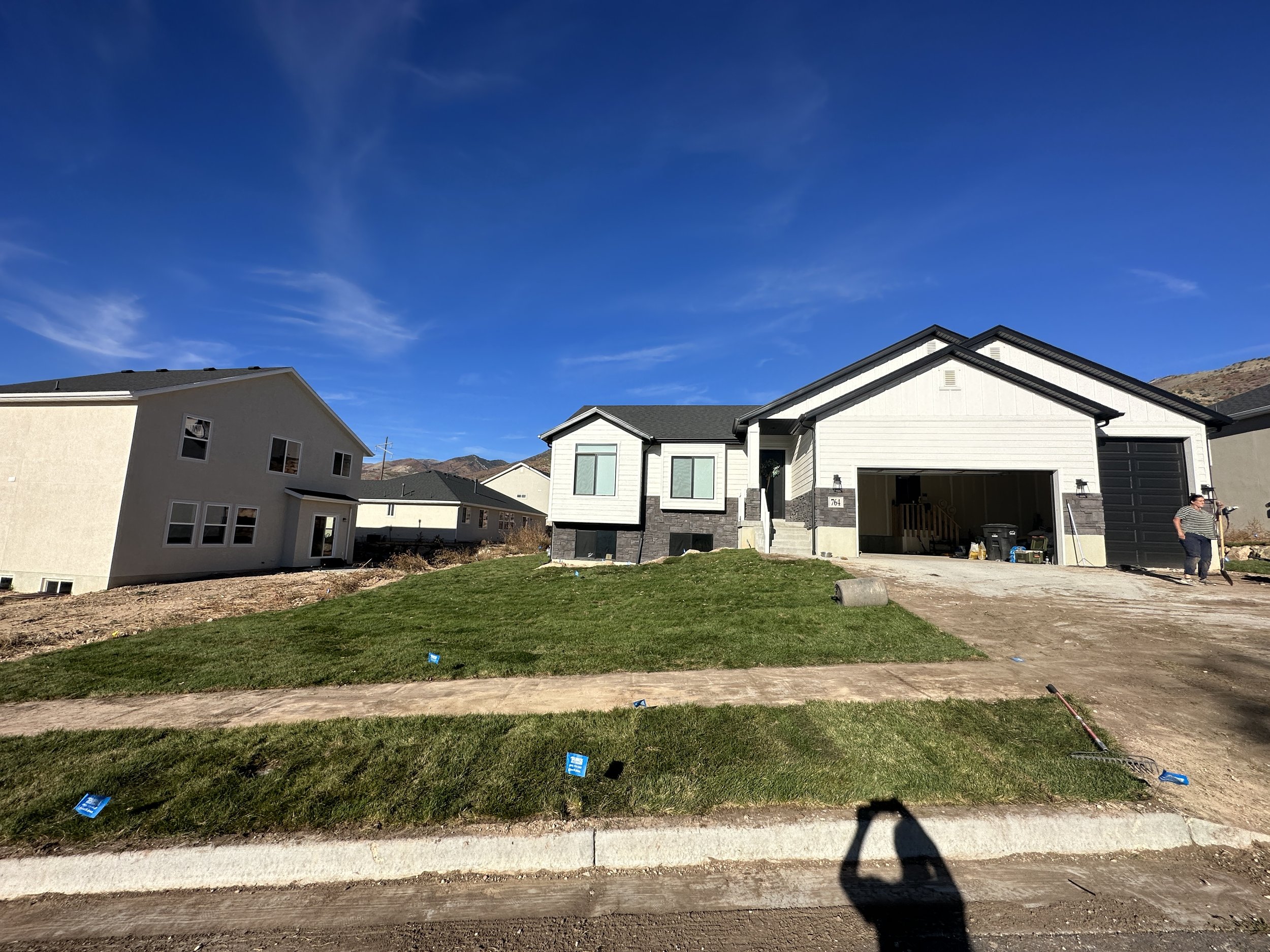 Sprinklers, sod, and rock landscaping.